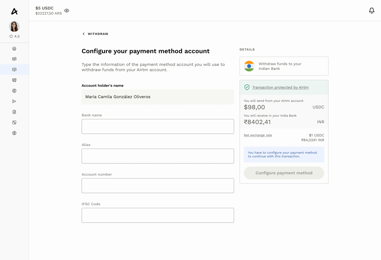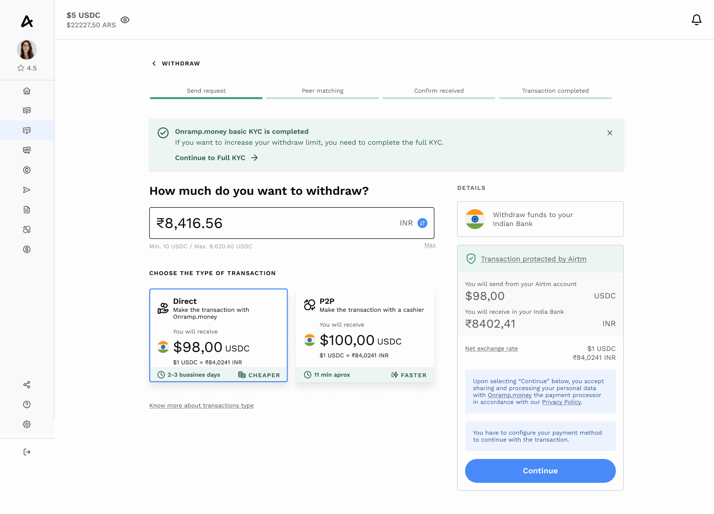 Airtm mostrará instantáneamente la tasa de cambio de USDC → INR para que puedas ver exactamente cuánto recibirás.